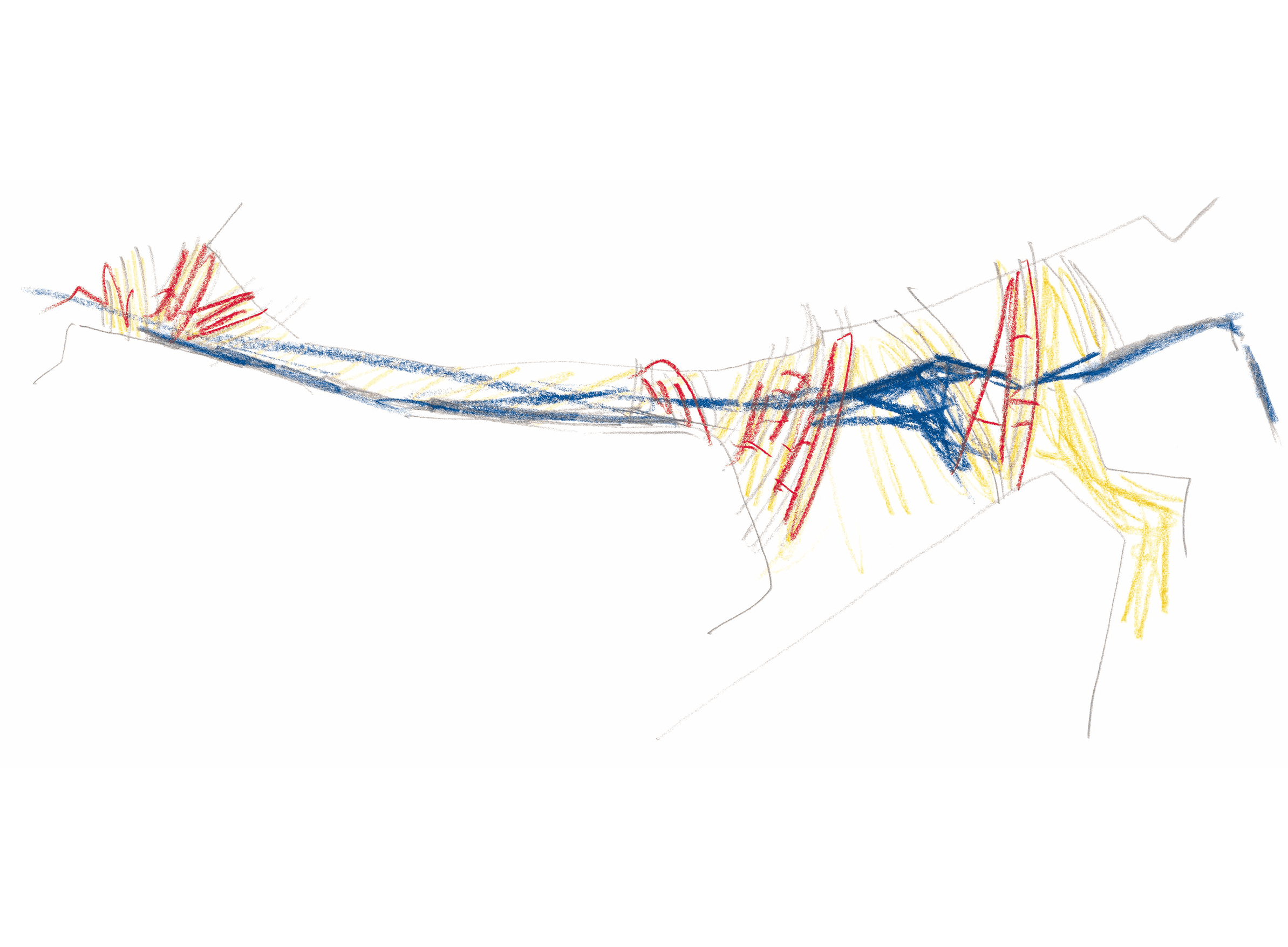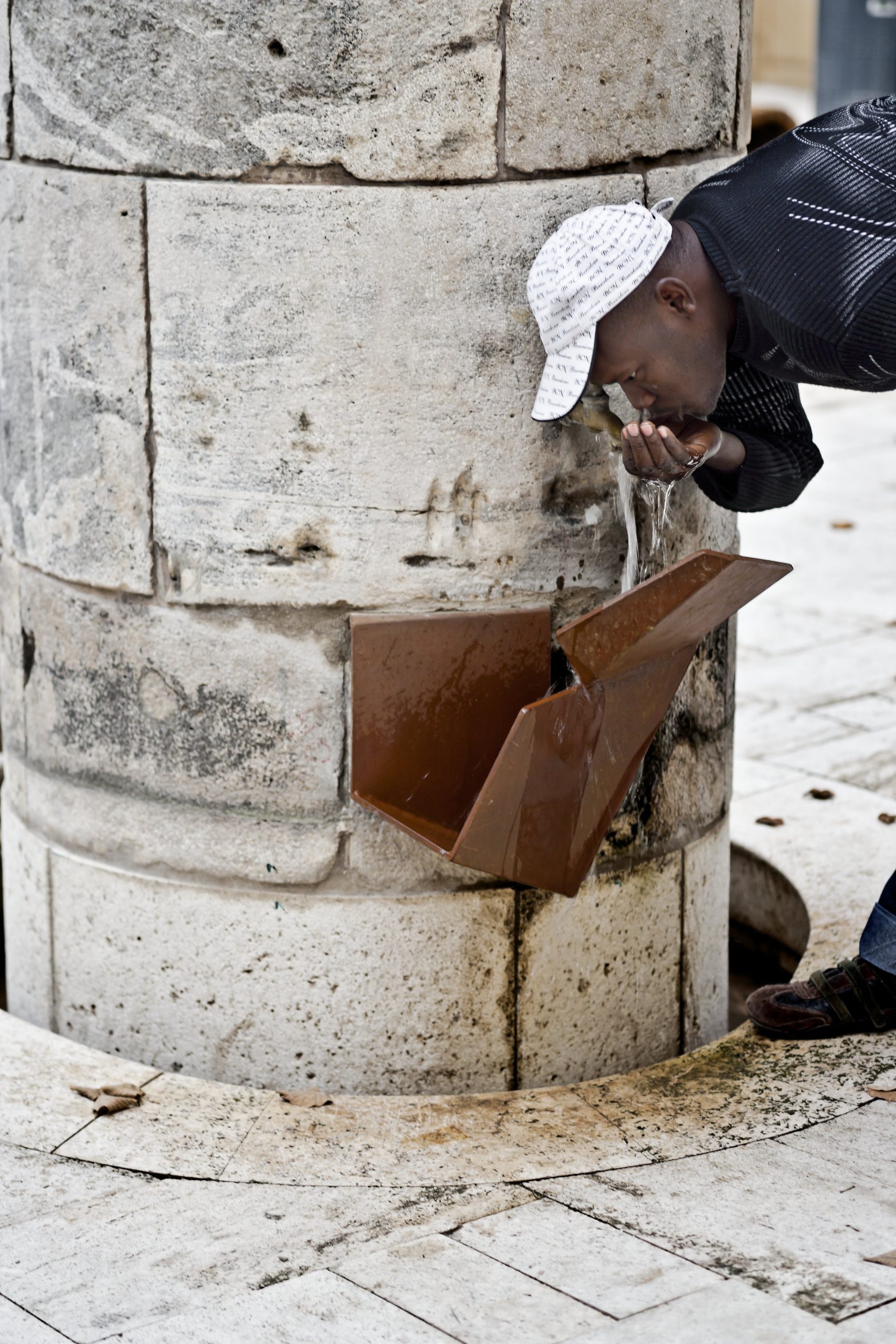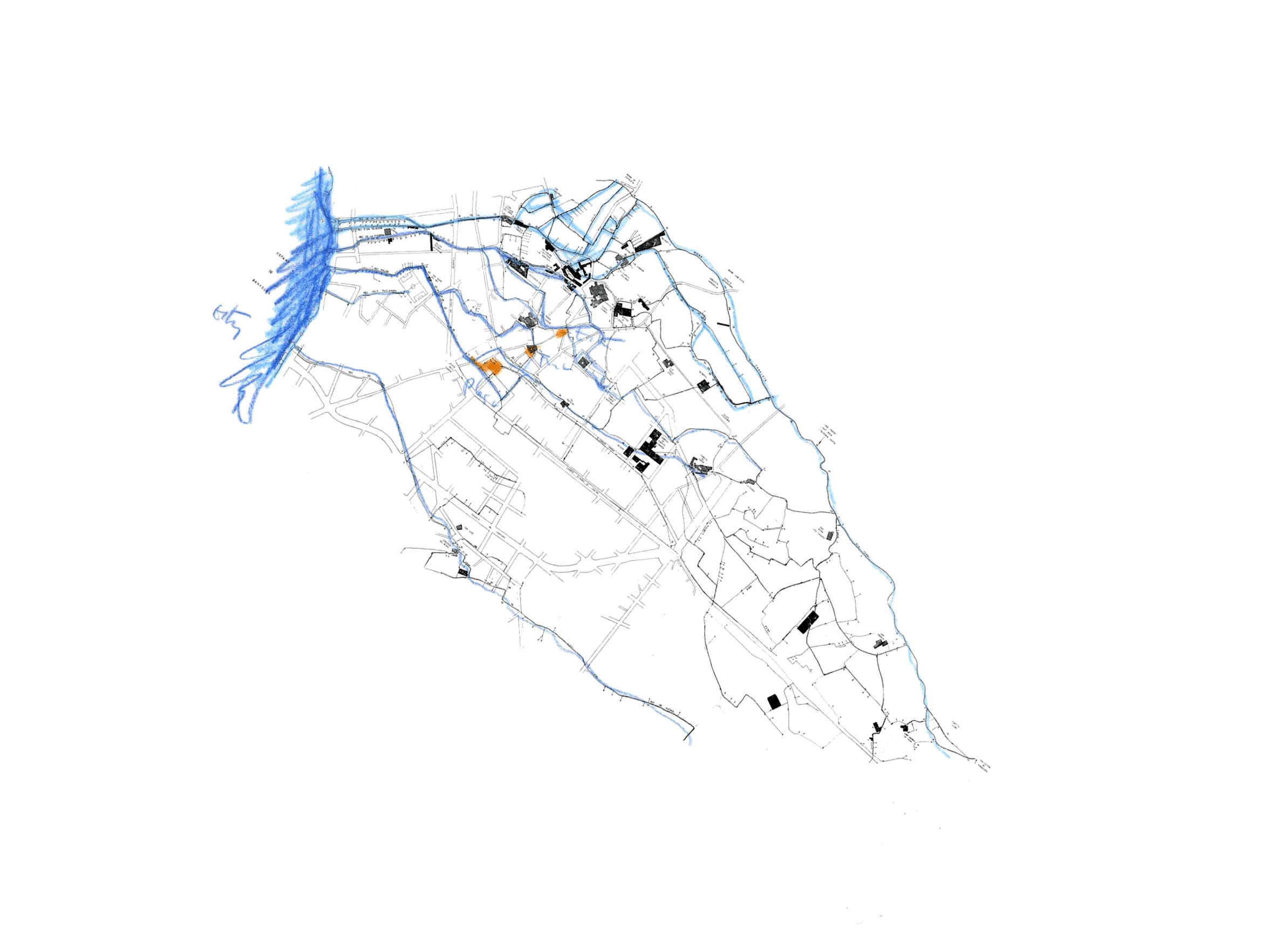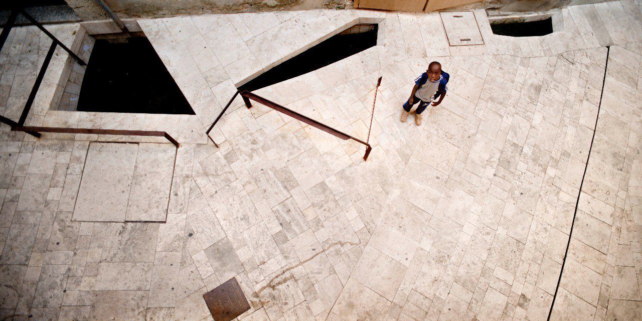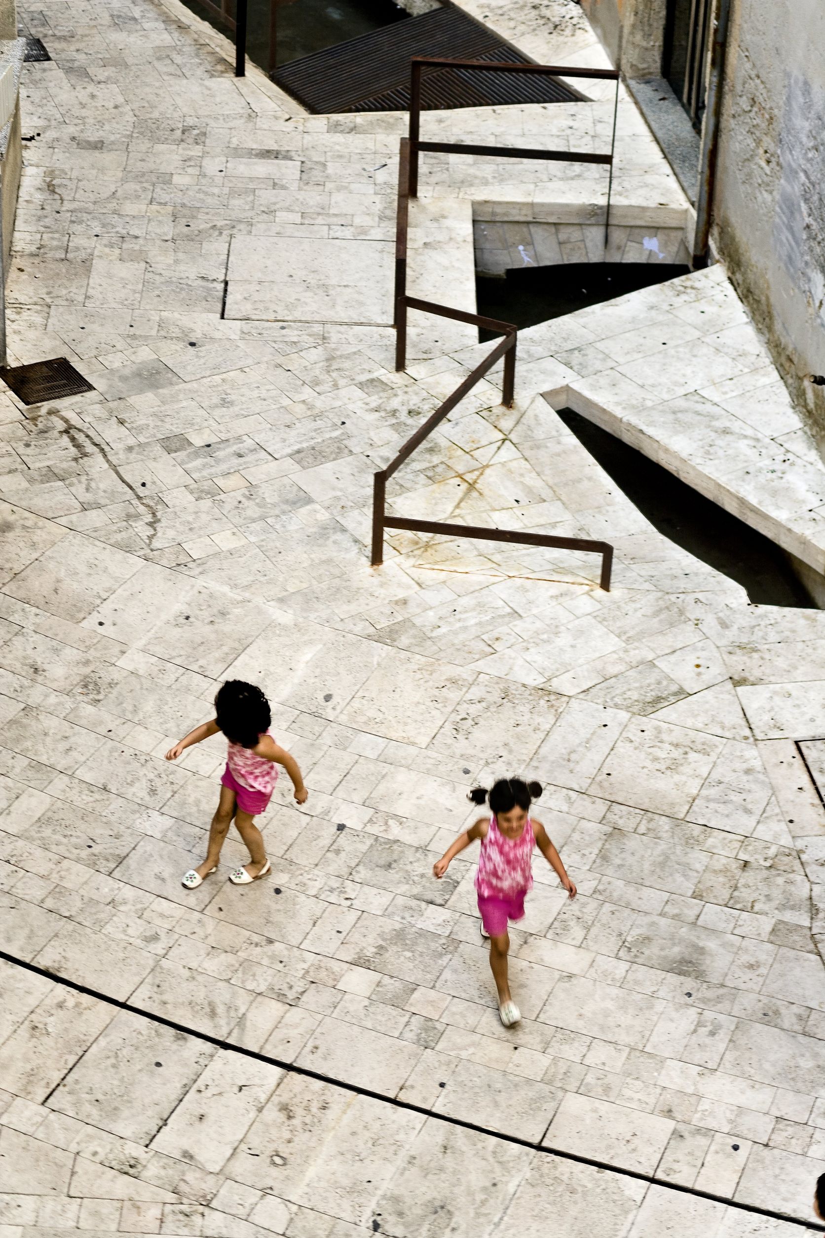 The proliferation of this tiling arrives in the streets and minor squares in different phases of the project. The irrigation system is uncovered intermittently across the pedestrian ways and eventually opened in bigger sections so children can play as if they were in front of a puddle of water.