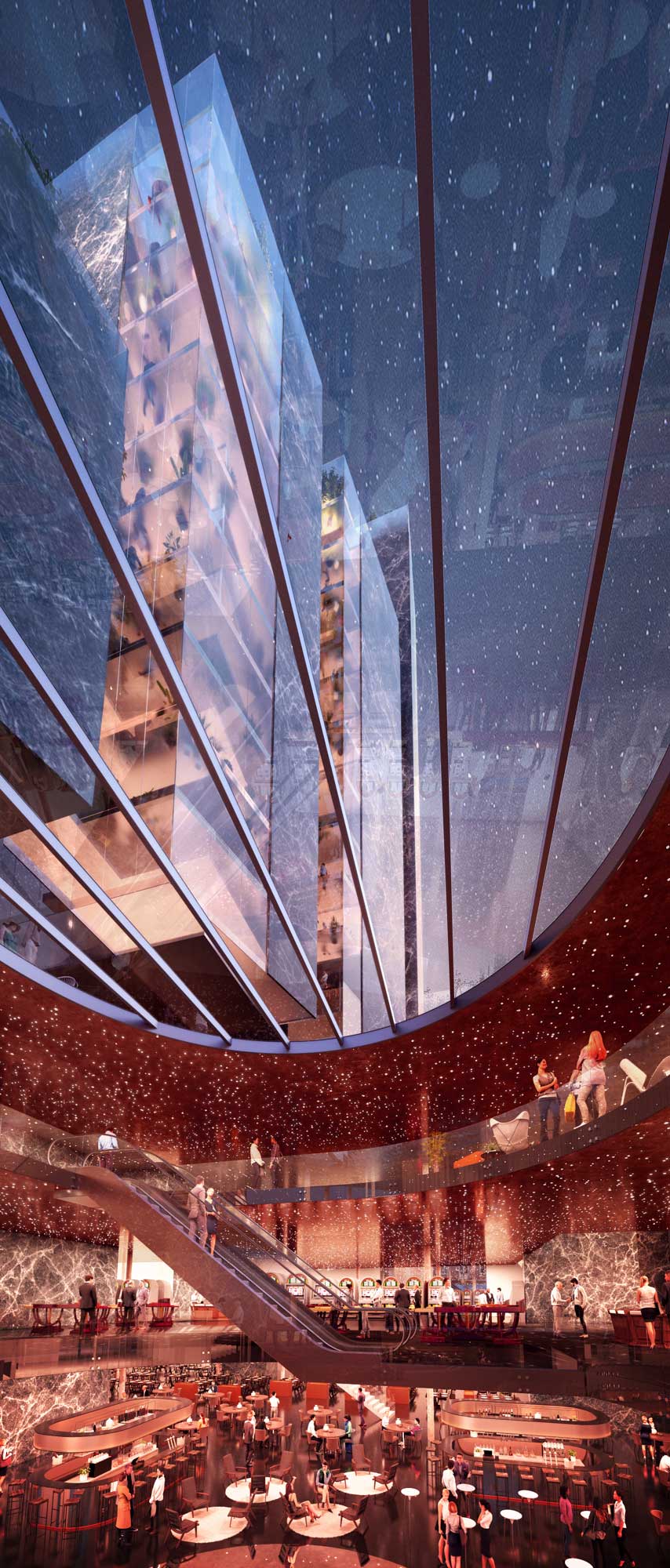 The casino spaces are distributed throughout the main floor, providing various distribution options for specific game related rooms and further restaurants. Unique and exclusive game experiences in privacy can will be facilitated on the first floor slightly separated from the lover levels. A medical center and clinic fills the following two floors, while the 8th floo is spared for the SPA area. On the upper levels of the building, luxurious homes with exceptional views top up the building. In the fast changing 21th century this multi facetted building combining public and private spaces and possibilities, responds to the requirement of a modern and contemporary city.