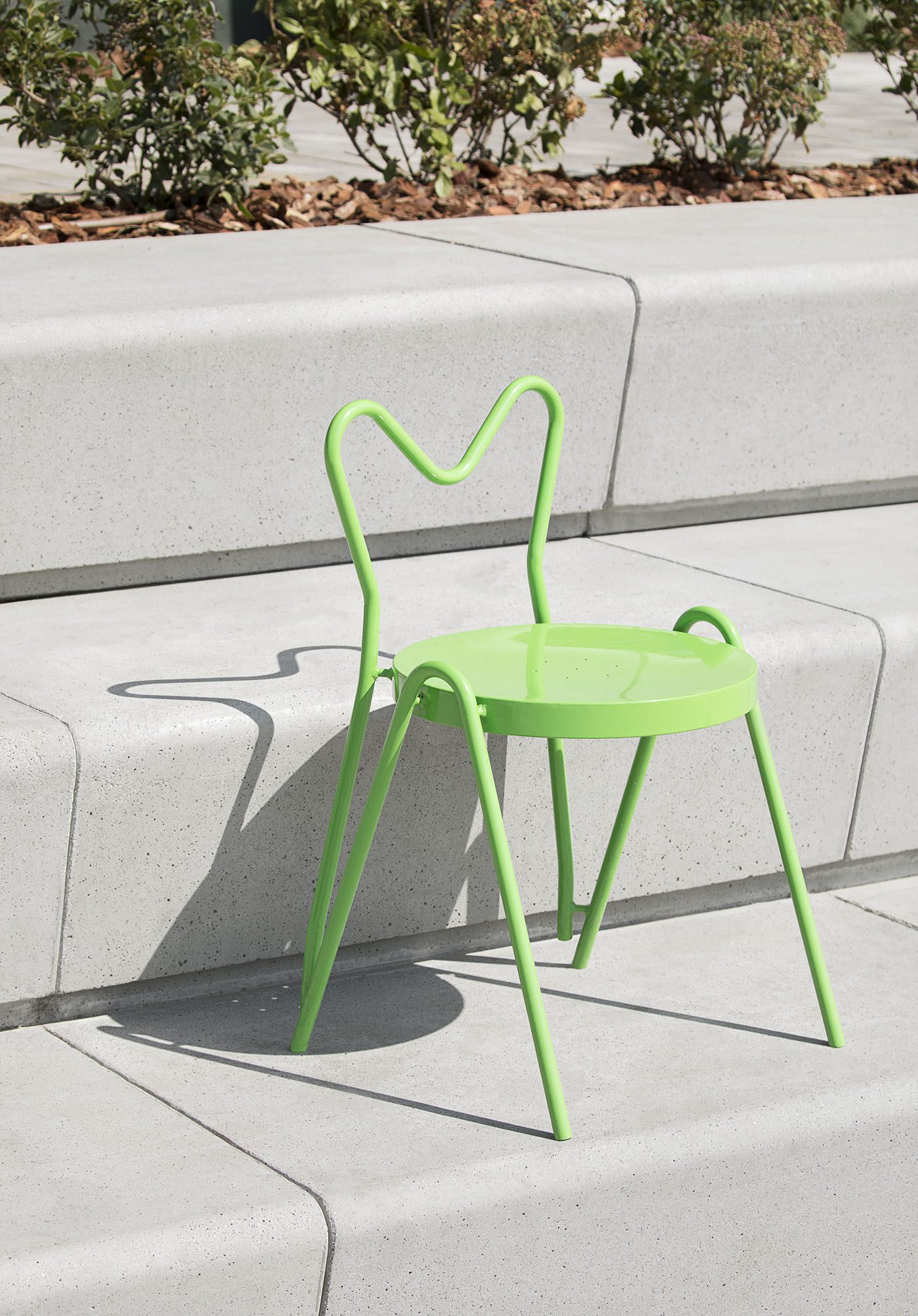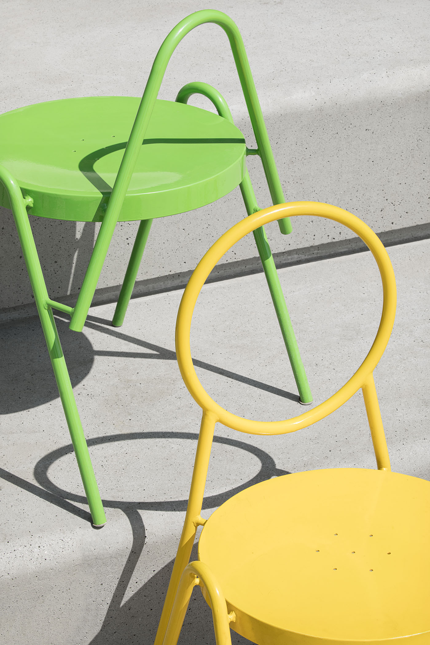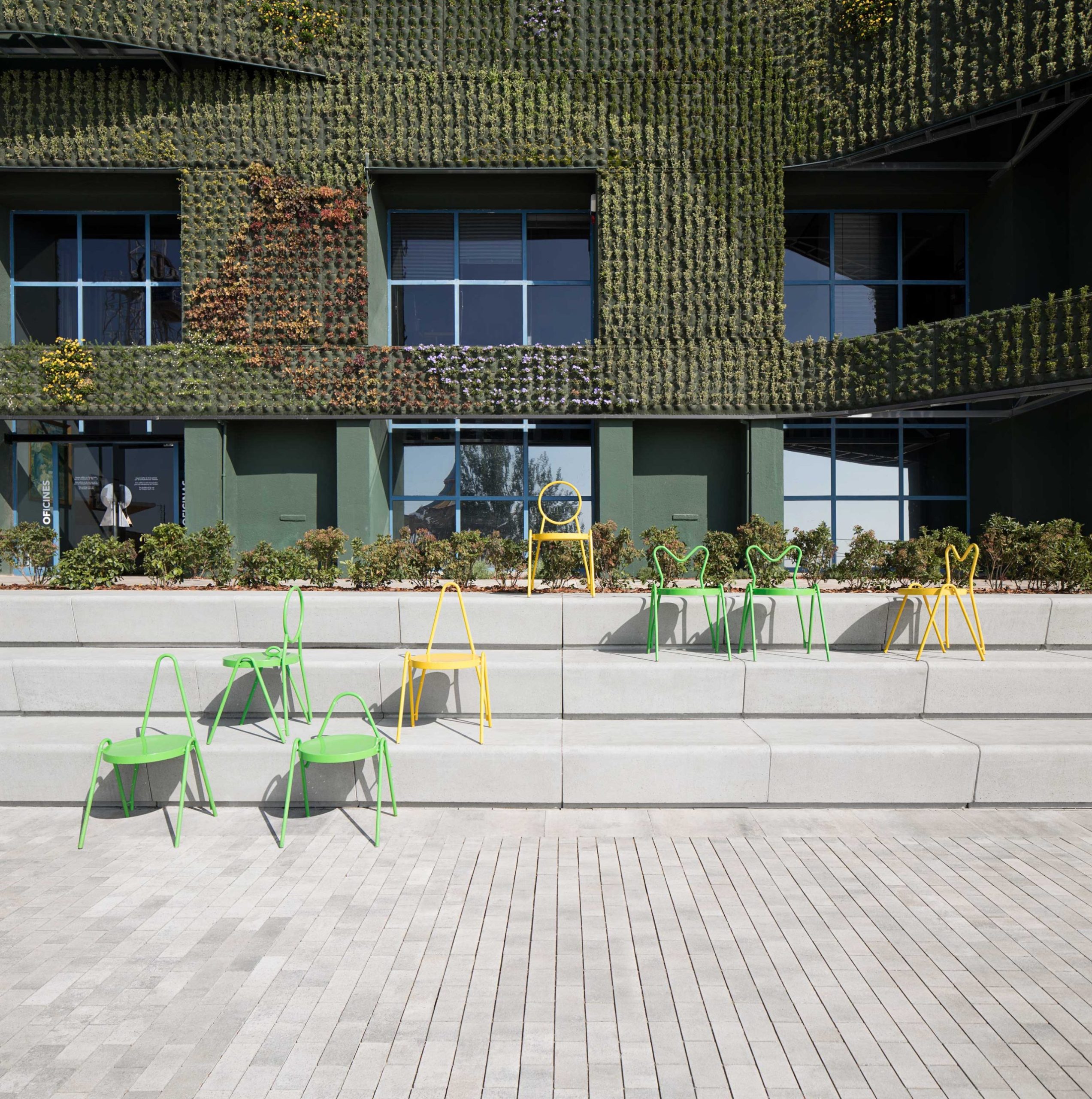 While the Daisies open their white and green petals over the visitors, below the chairs continue the playful design. These simple and round-shaped green and yellow iron stools and tables are gathered around the parasols, which are anchored to the ground by benches designed as leaves. Plain iron rods in a zigzag course hold the round seat and lead to the backrest of the chair whose geometrical shapes change between circles, triangles and inverted triangles.