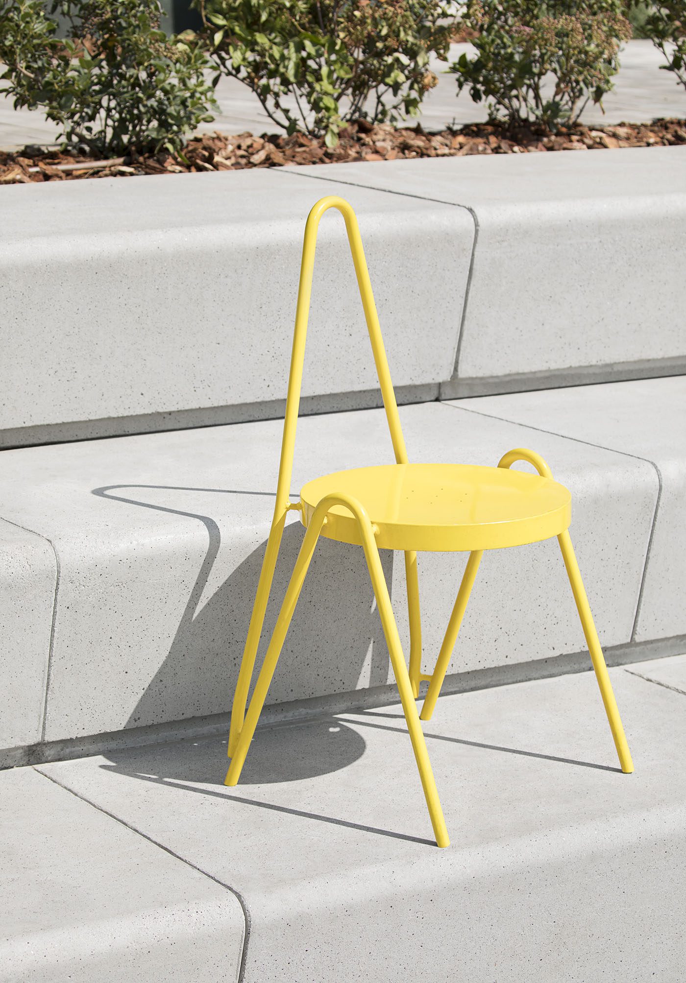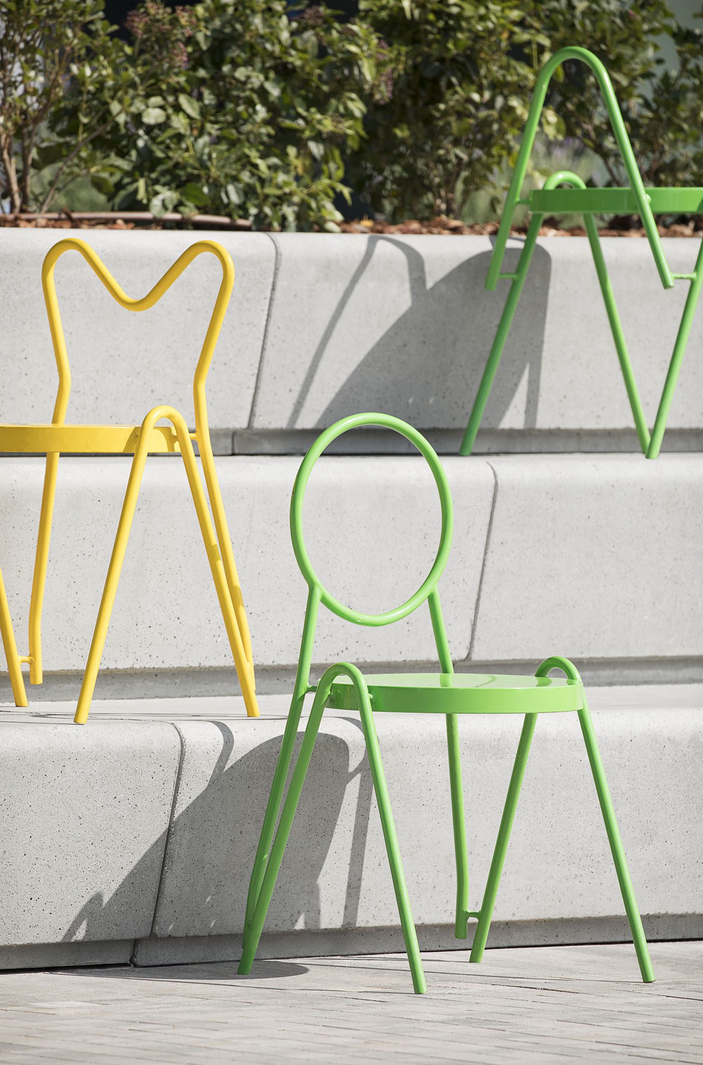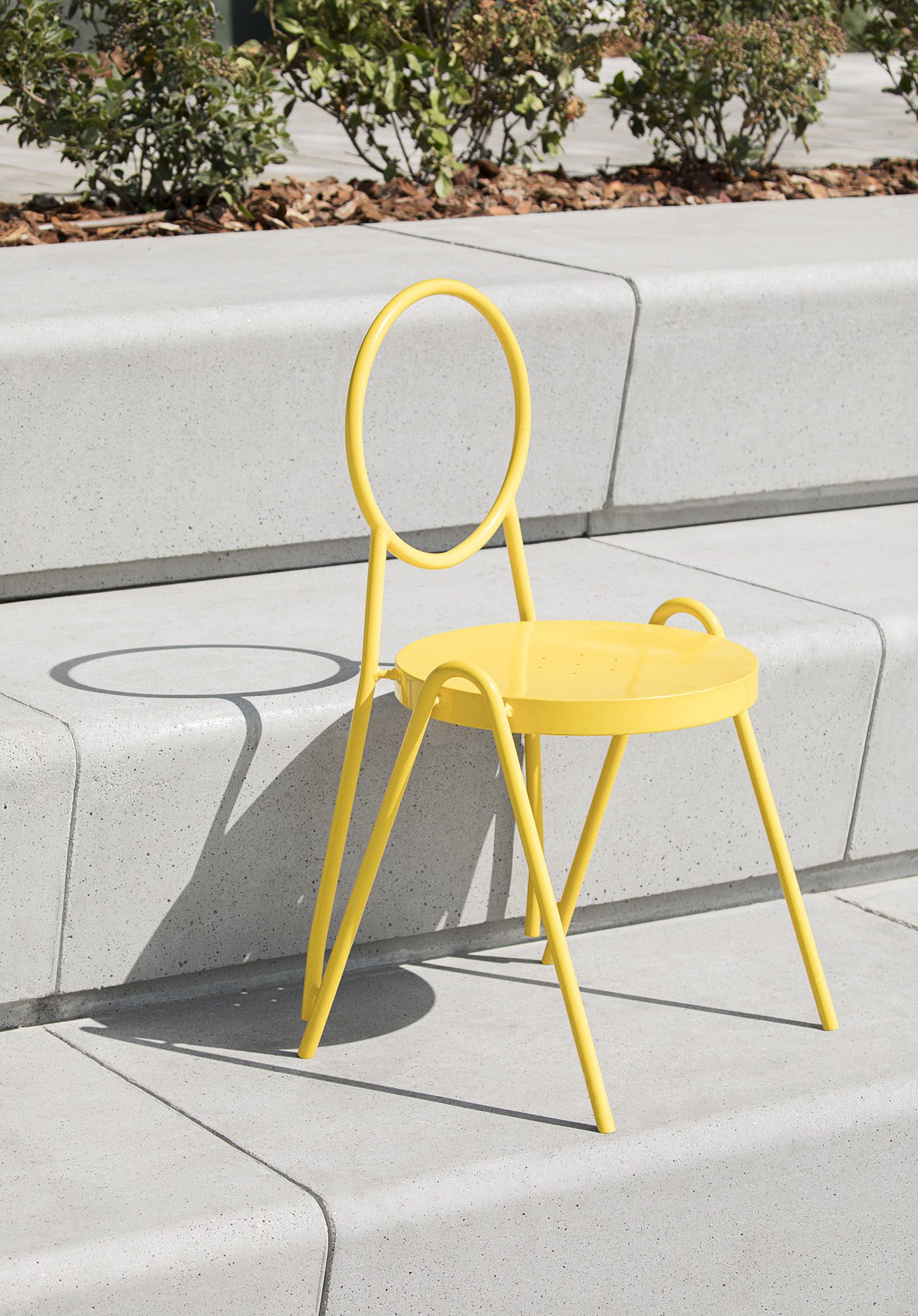 While the Daisies open their white and green petals over the visitors, below the chairs continue the playful design. These simple and round-shaped green and yellow iron stools and tables are gathered around the parasols, which are anchored to the ground by benches designed as leaves. Plain iron rods in a zigzag course hold the round seat and lead to the backrest of the chair whose geometrical shapes change between circles, triangles and inverted triangles.