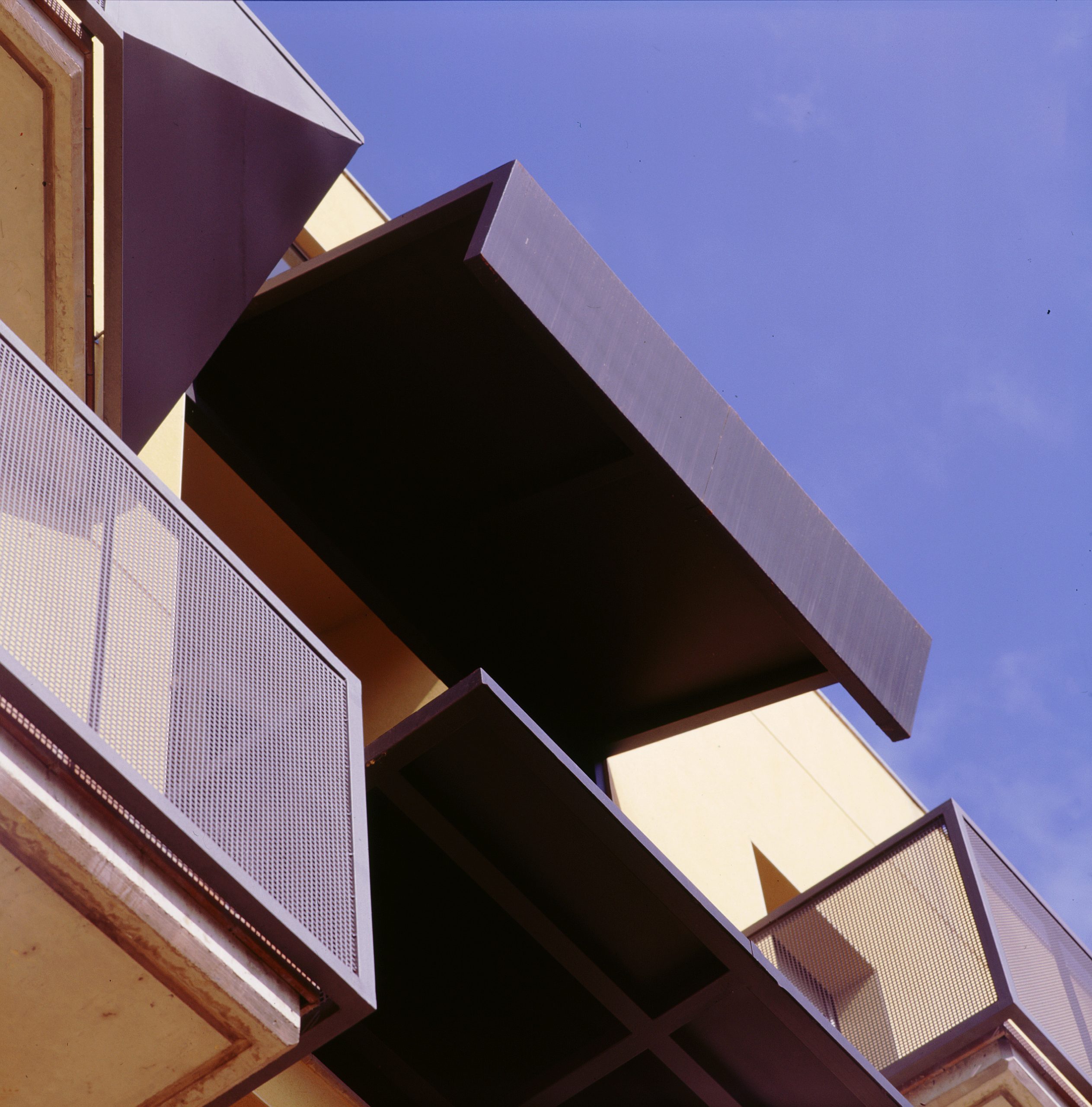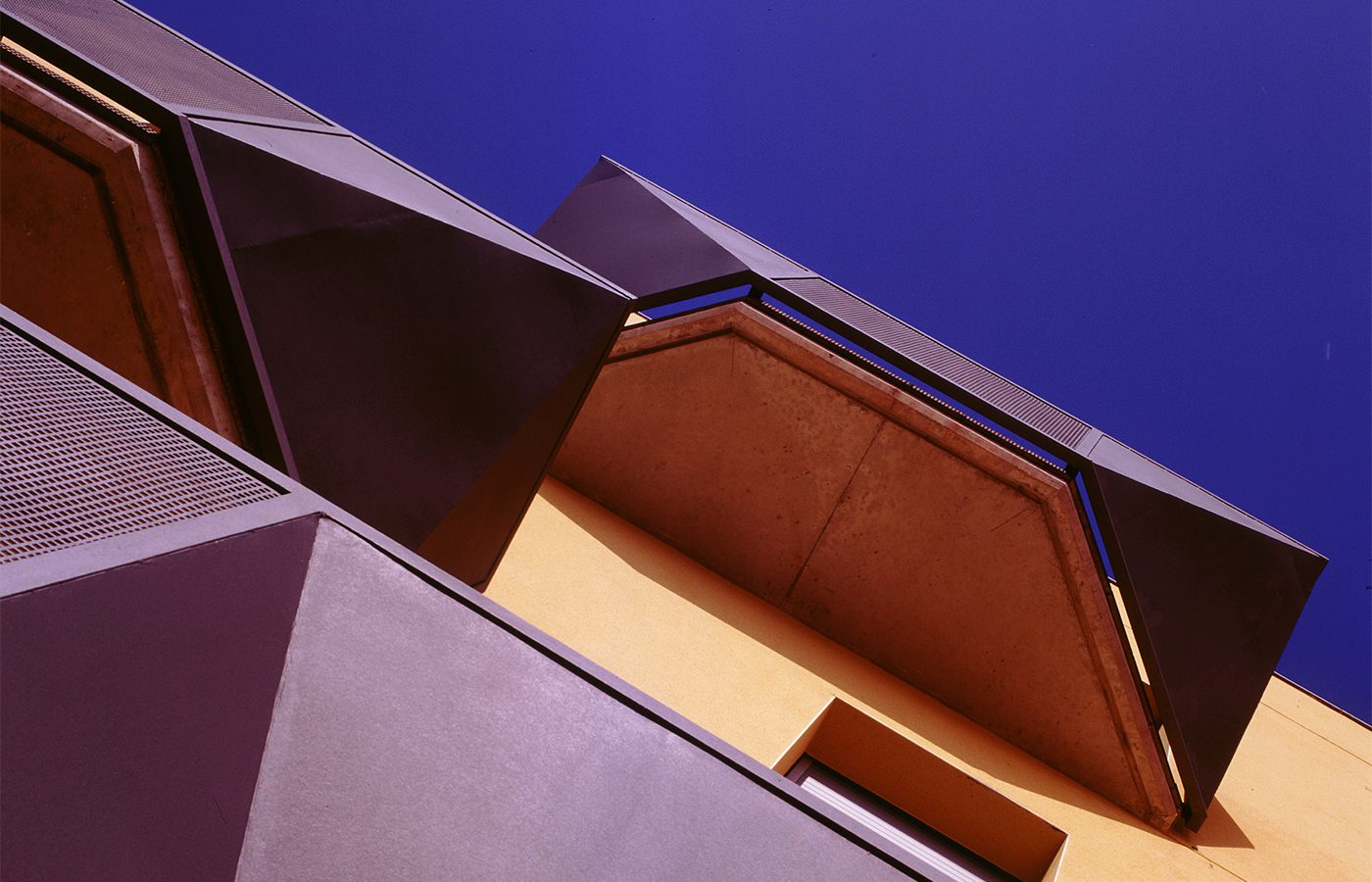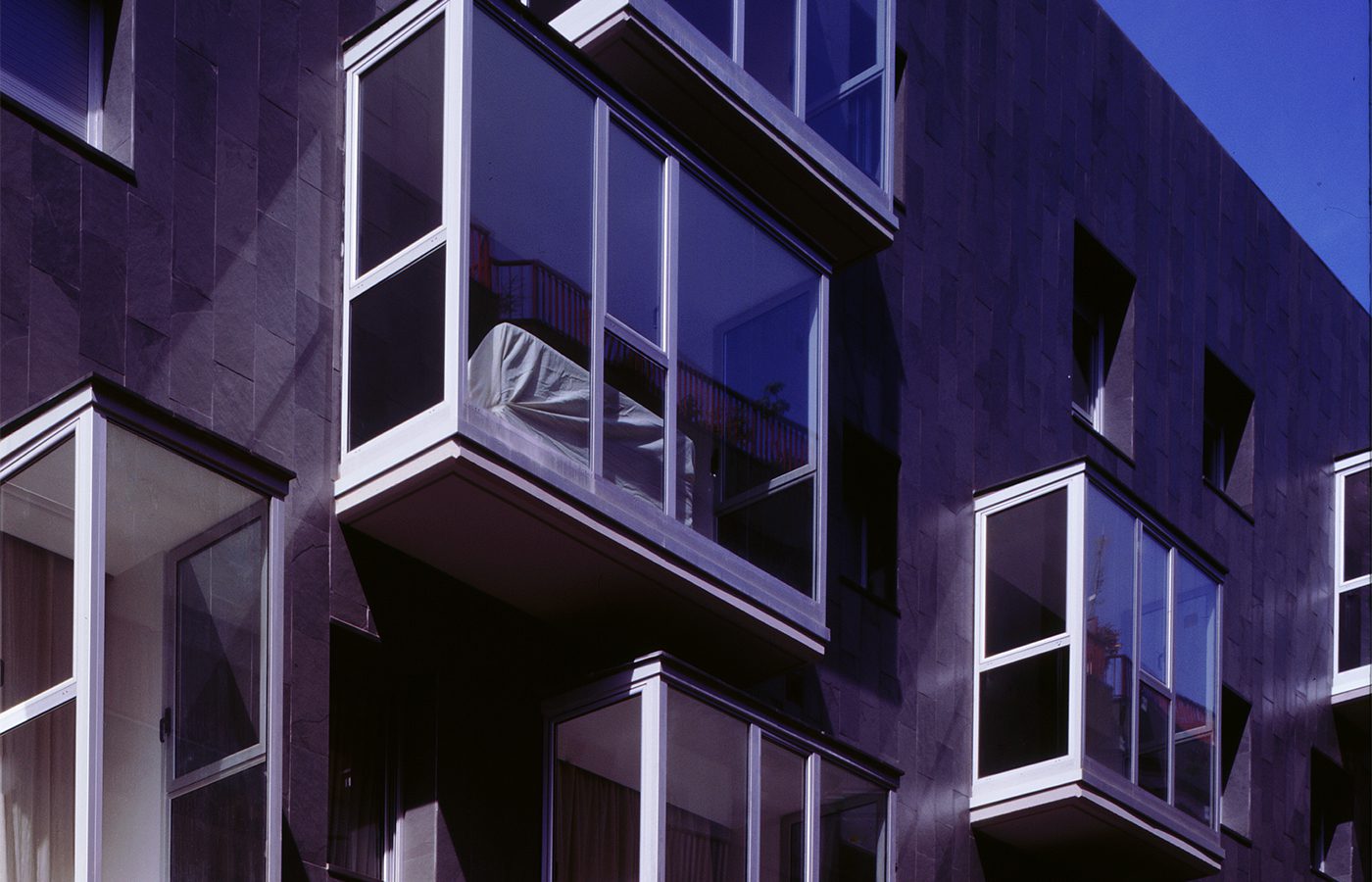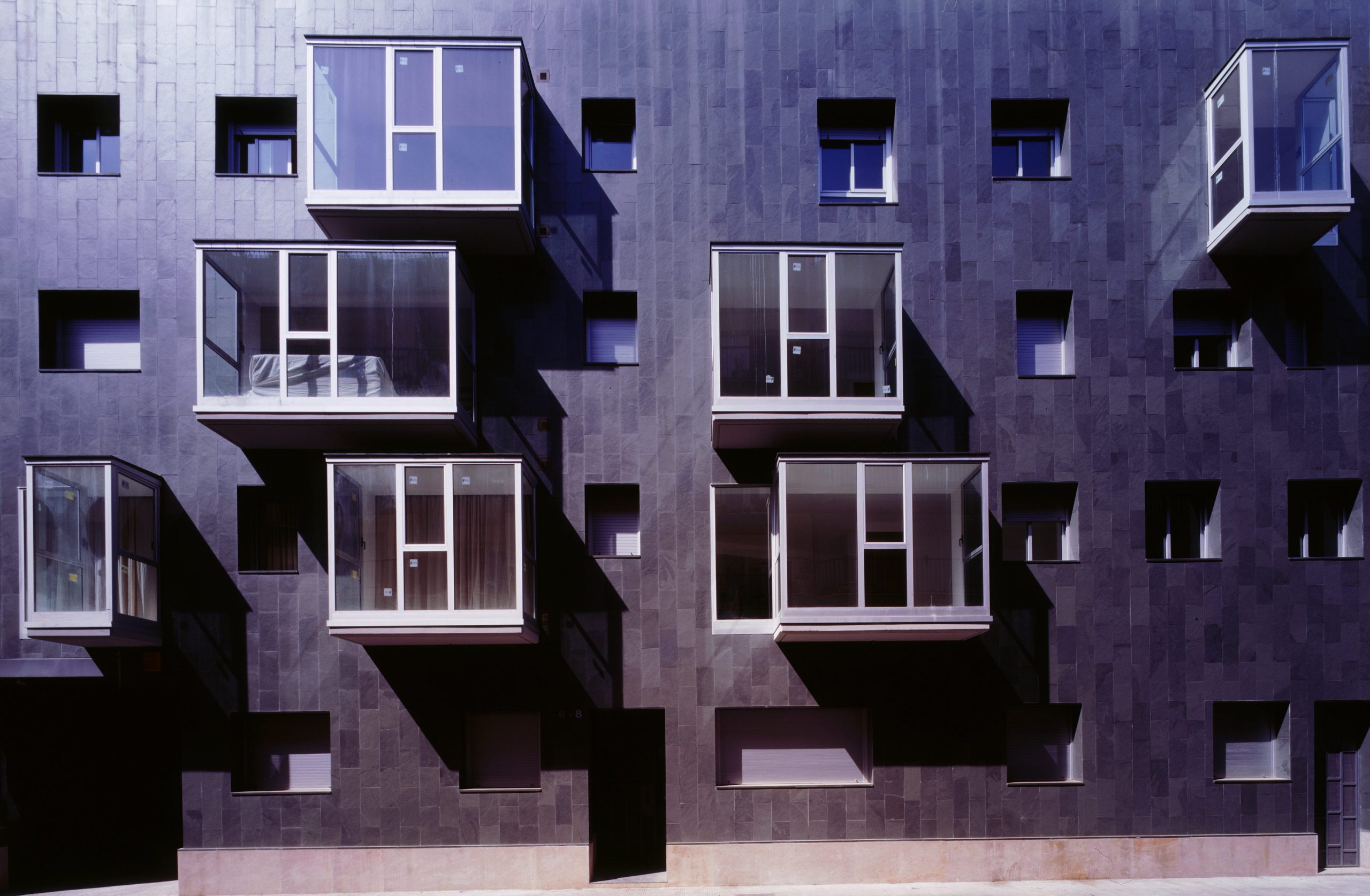 The building provides a contemporary innovative take on modern living. Each apartment is unique in its shape and appearance due to the widows breaking the facades with their different shapes and appearances. The dark facade covers the light insight of the building. Inside and outside are connected through a outside staircase connecting the different levels of the apartment with an elevator on its interior. Two uncovered patios organize additionally the distribution of the public and private space. The houses overlook both to the main façade with glass covered balconies and to the back with small open ones. The stone facade additionally references to the materials used in the mountains of the region.