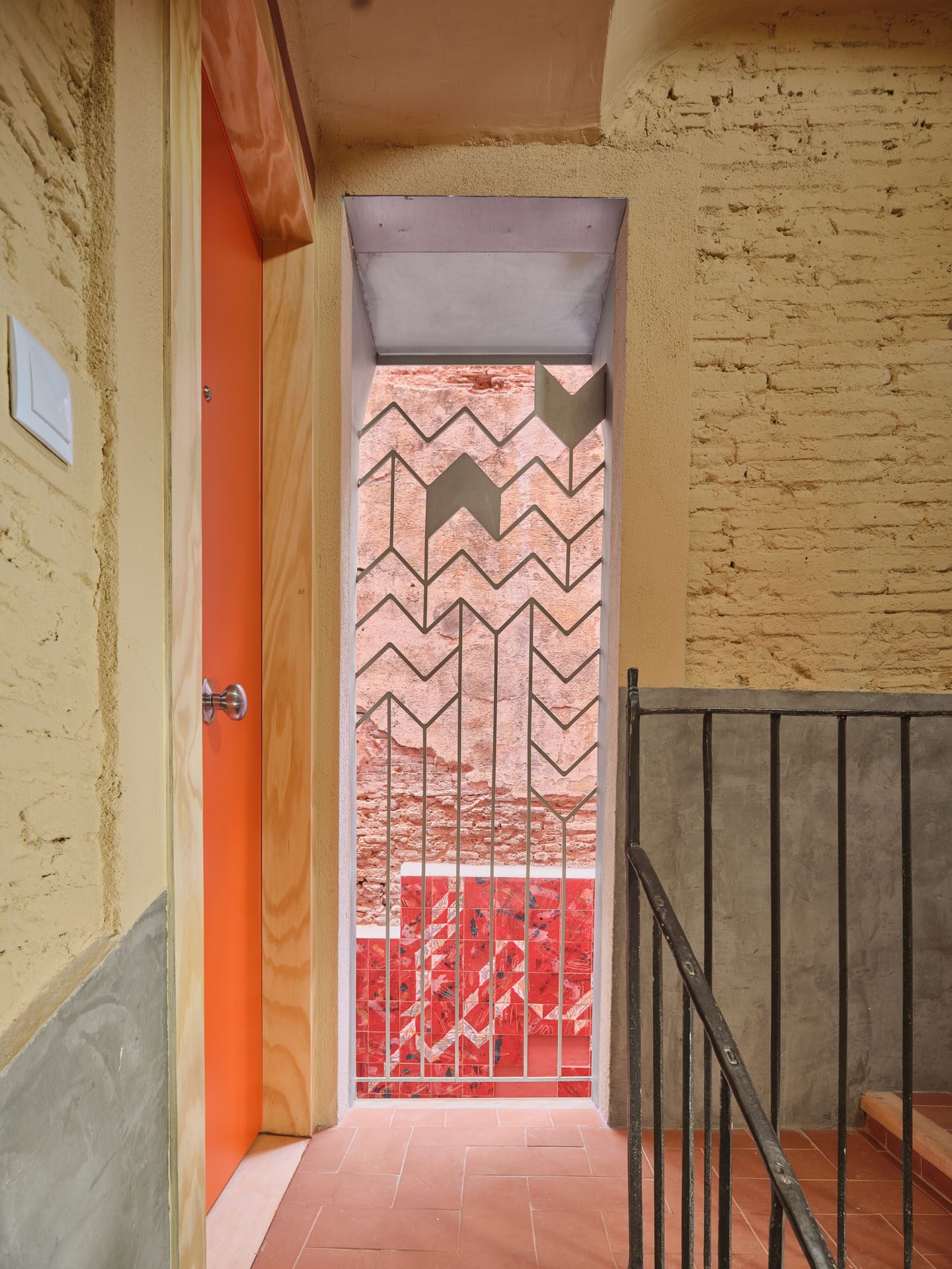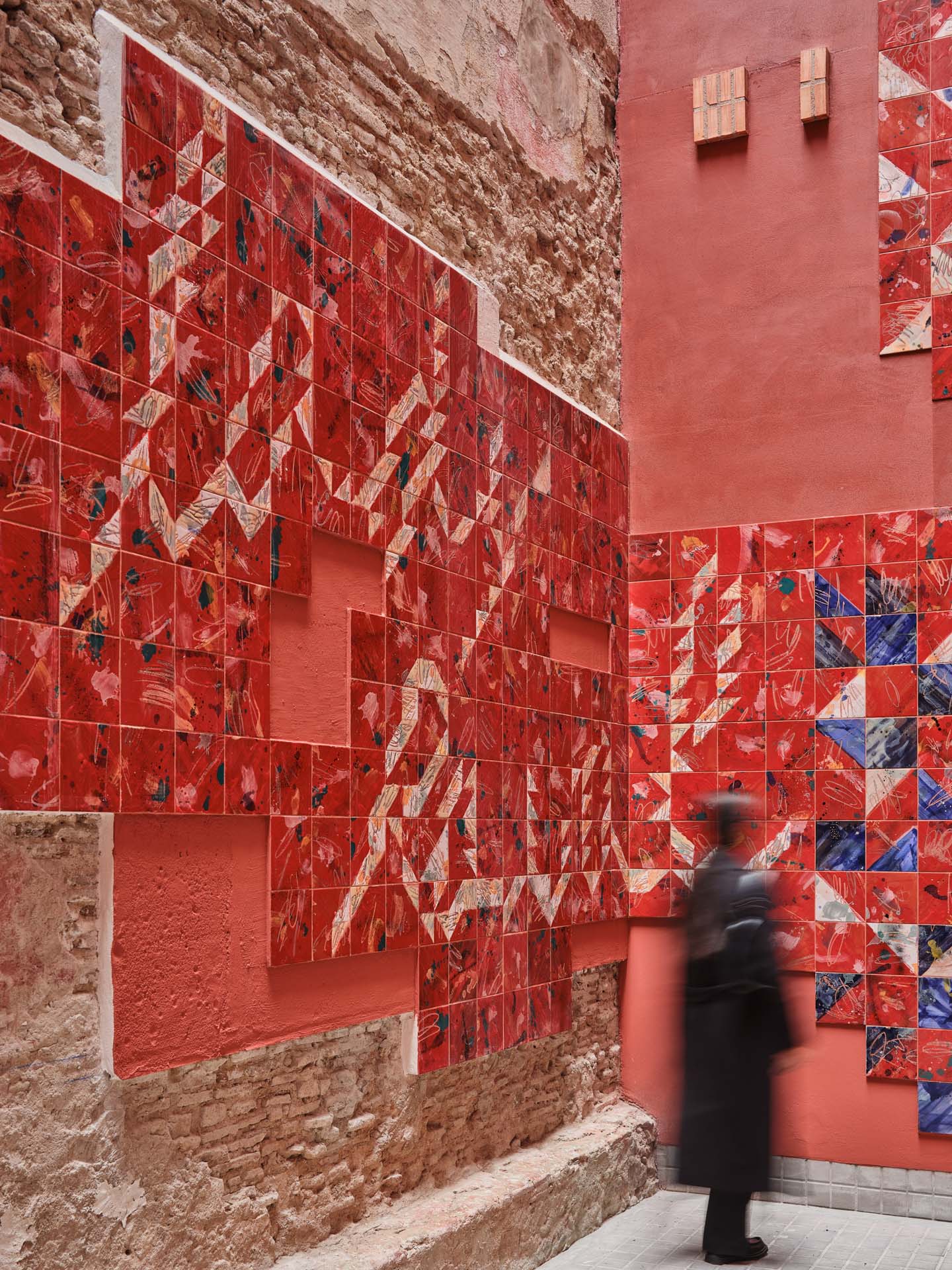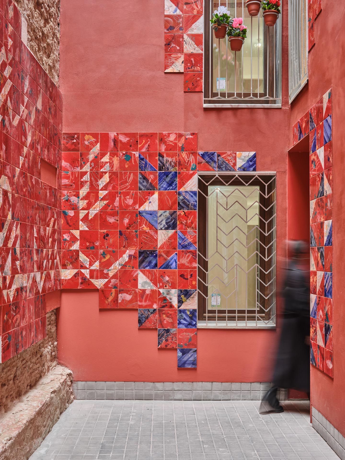 This new courtyard fosters social interaction and a sense of belonging. Its perforated enclosure walls are clad in humble materials, while the openings are framed with ceramic elements inspired by textiles and garments. These ceramics, crafted by Carlos Jiménez Cenamor—architect and ceramist—draw on patterns and geometries typical of the residents’ places of origin and reflect the vibrant, optimistic colours of their cultural traditions.